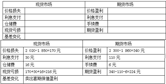 某大型糧油綜合企業(yè)集團于2013年3至4月間在東北產(chǎn)區(qū)收購了5萬噸玉米。為規(guī)避玉米價格下跌風(fēng)險,避免現(xiàn)貨損失,該企業(yè)進入期貨市場進行庫存賣出套期保值操作。4月28日,企業(yè)以2 300元/噸價位賣出C905合約5 000手,手續(xù)費6元/噸,利息110元/噸。當(dāng)時現(xiàn)貨價格為2 020元/噸,現(xiàn)貨尚未簽訂銷售合同。后來,受金融危機影響,期貨和現(xiàn)貨價格果然下跌,至8月17日,期貨價格下跌至1 960元/噸,而現(xiàn)貨價格下跌至1 850元/噸;此時,該企業(yè)的現(xiàn)貨銷售完畢,同時在期貨市場平倉出場。倉儲費16元/噸,利息30元/噸。期貨市場的盈利不但彌補現(xiàn)貨市場的損失,而且還有盈余。