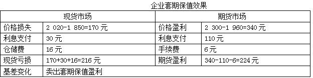 (2)通過對比分析可以看到,如果該企業(yè)不進行套期保值,那么現(xiàn)貨購銷價格虧損為216元/噸,5萬噸總計虧損1080萬元;由于企業(yè)進行了套期保值,最終反而實現(xiàn)盈利224-216=8元/噸,5萬噸總計盈利40萬元。