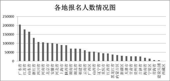 2014年度全國會計資格考試報名人數超過15萬人以上的地區(qū)有廣東、江蘇、山東等3個省,占全國報名總數的25%;報名人數在10萬-15萬人的地區(qū)有浙江、四川、河南、北京、安徽等5個。ㄊ校,占全國報名總數的26%;報名人數在5-10萬人的地區(qū)有河北、上海、湖南、湖北、福建、云南、陜西、廣西、山西等9個省(區(qū)、市),占全國報名總數31%;報名人數在5萬以下的地區(qū)有遼寧、重慶、江西、黑龍江、內蒙古、新疆、天津、甘肅、貴州、吉林、海南、寧夏、青海、兵團、西藏等14個省(區(qū)、市)及新疆生產建設兵團,占全國報名總數的18%。