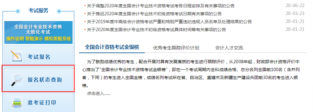 1.登陸全國(guó)會(huì)計(jì)資格評(píng)價(jià)網(wǎng)http://kzp.mof.gov.cn/,找到報(bào)名狀態(tài)查詢(xún)版塊