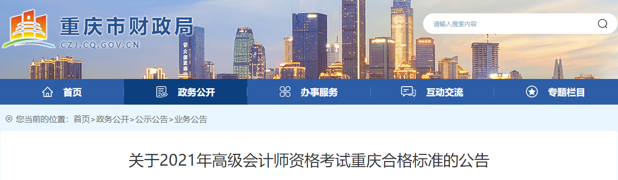 根據(jù)財(cái)政部會(huì)計(jì)資格評(píng)價(jià)中心《關(guān)于下發(fā)2021年度全國(guó)會(huì)計(jì)技術(shù)高級(jí)資格考試成績(jī)等有關(guān)事項(xiàng)的通知》(會(huì)評(píng)【2021】12號(hào))精神,2021年度會(huì)計(jì)專業(yè)技術(shù)高級(jí)資格考試成績(jī)已在“全國(guó)會(huì)計(jì)資格評(píng)價(jià)網(wǎng)”上公布??忌蛇M(jìn)“重慶市財(cái)政局”官網(wǎng)“會(huì)計(jì)之家”查詢成績(jī)。根據(jù)我市會(huì)計(jì)專業(yè)人員的考試情況,2021年我市合格標(biāo)準(zhǔn)按60分執(zhí)行。