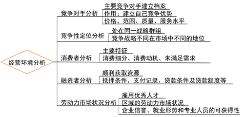 經(jīng)營環(huán)境分析包括競爭對手分析、競爭性定位分析、消費者分析、融資者分析、勞動力市場狀況分析等。