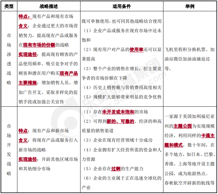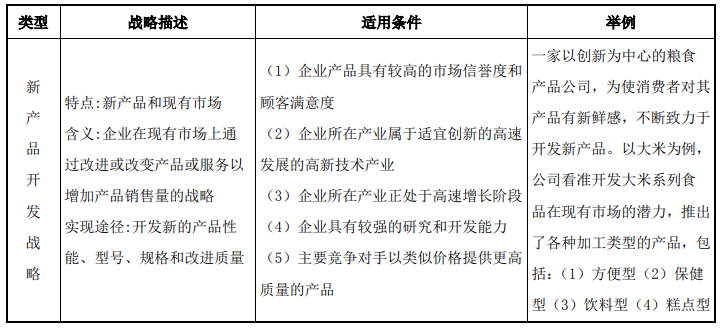 密集型戰(zhàn)略具體類型有:市場(chǎng)滲透、市場(chǎng)開(kāi)發(fā)、新產(chǎn)品開(kāi)發(fā)(自己開(kāi)拓市場(chǎng)、自己創(chuàng)新產(chǎn)品)。 本教材將多元化戰(zhàn)略分為成長(zhǎng)型戰(zhàn)略之一。