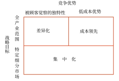 根據(jù)在市場(chǎng)競(jìng)爭(zhēng)中獲得競(jìng)爭(zhēng)優(yōu)勢(shì)的途徑,分為三種基本戰(zhàn)略:成本領(lǐng)先戰(zhàn)略、差異化戰(zhàn)略、集中化戰(zhàn)略。