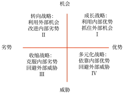 第Ⅱ象限面臨巨大的外部機(jī)會(huì),卻受到了內(nèi)部劣勢的限制,應(yīng)當(dāng)采取轉(zhuǎn)向戰(zhàn)略,充分利用外部機(jī)會(huì),設(shè)法消除內(nèi)部劣勢。