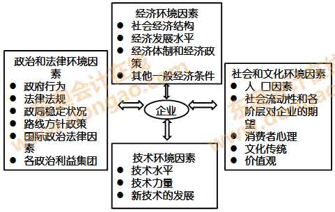。4)技術(shù)環(huán)境。包括:創(chuàng)新機(jī)制、科技投入、技術(shù)總體水平、技術(shù)開(kāi)發(fā)應(yīng)用速度及壽命周期、企業(yè)競(jìng)爭(zhēng)對(duì)手的研發(fā)投入,社會(huì)技術(shù)人才的素質(zhì)水平和待遇等。企業(yè)宏觀(guān)環(huán)境因素的四個(gè)方面可用圖反映。