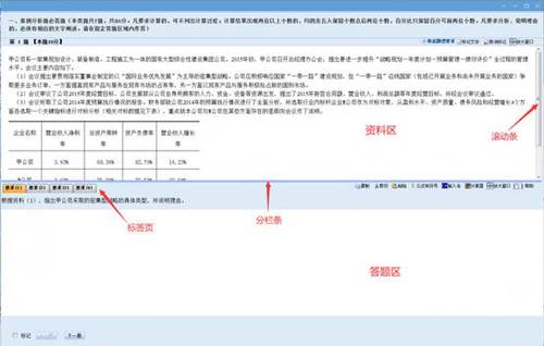 1.案例分析題必答題、案例分析題選答題都是上下分欄,上欄為資料區(qū),下欄為答題區(qū)。考生可根據(jù)需要上下拖動分欄條和右側滾動條,調整資料區(qū)或答題區(qū)的可視區(qū)域。答題區(qū)根據(jù)考試題目要求分為“要求(1)”、“要求(2)”、“要求(3)”等多項標簽頁。考生按照要求在各自答題區(qū)域內(nèi)進行答題。
