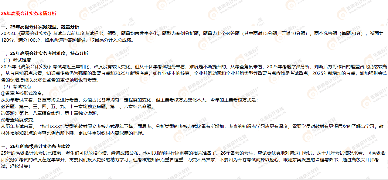 2025年高級(jí)會(huì)計(jì)師考試已經(jīng)結(jié)束。想必考生們對(duì)考試試題的考點(diǎn)所在及考試情況很好奇,東奧會(huì)計(jì)根據(jù)2025年高會(huì)考試試題情況,整理了考點(diǎn)分析及考情分析,讓我們一起了解具體情況吧!