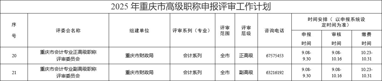 各高級(jí)職稱評(píng)委會(huì)受理范圍、申報(bào)評(píng)審時(shí)間及聯(lián)系方式見(jiàn)《2025年重慶市高級(jí)職稱申報(bào)評(píng)審工作計(jì)劃》(附件1,具體以申報(bào)系統(tǒng)設(shè)定時(shí)間為準(zhǔn)),各區(qū)縣職稱改革辦公室聯(lián)系方式見(jiàn)《重慶市區(qū)縣(自治縣)職稱改革辦公室通訊錄》(附件2)。