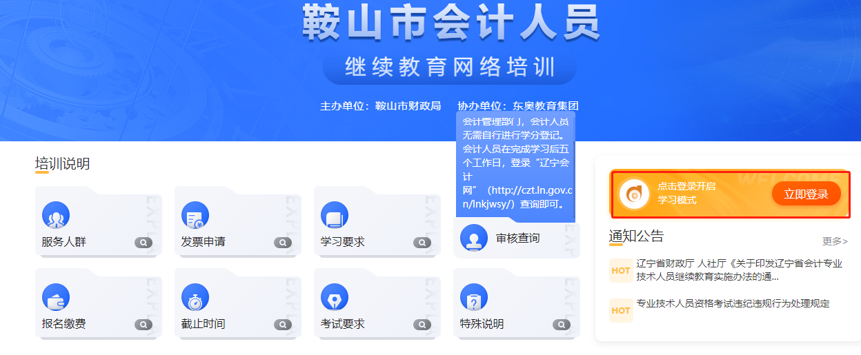 其二,學員也可以直接登錄鞍山市東奧繼教網(wǎng)站進行登錄學習,其網(wǎng)址為https://anshan.dongao.com/。