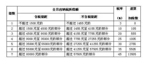 這則消息最受益群體是廣大工薪階層,據(jù)調(diào)查,大部分人的工資現(xiàn)處在6000-10000元之間,但是3500的起征點仍然是六年前的標準,本來到手工資就不高,再加上個稅的扣除,收入更加捉襟見肘。本次個稅起征點調(diào)高對于工薪階層來說肯定是利大于弊。我國工資薪金所得稅納稅征收采用的是超額累進法,分為七個等級,稅率為3%~45%,工資越高,征收的個稅越高。詳情見下圖: