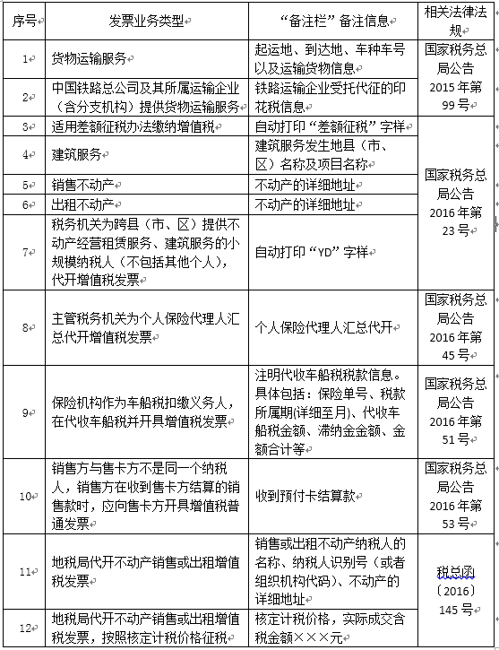 增值稅發(fā)票“備注欄”一覽表