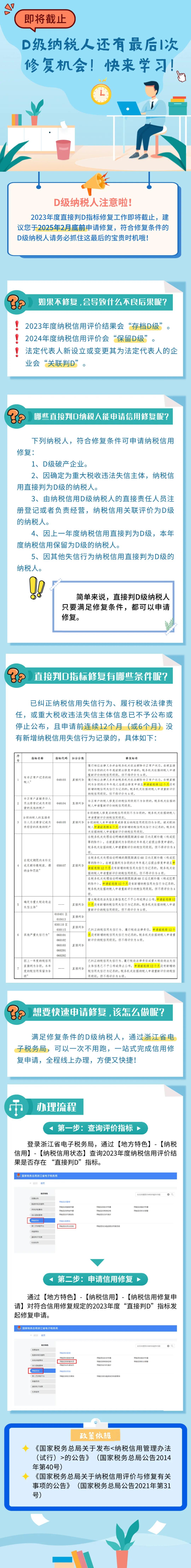 D級納稅人注意啦!2023年度直接判D指標修復工作即將截止,建議于2025年2月底前申請修復,符合修復條件的D級納稅人請務必抓住這最后的寶貴機會!其中,有關不修復會導致的結(jié)果有哪些?哪些直接判D的納稅人可以申請信用修復,都將為你詳細解答,快來看看正文吧!