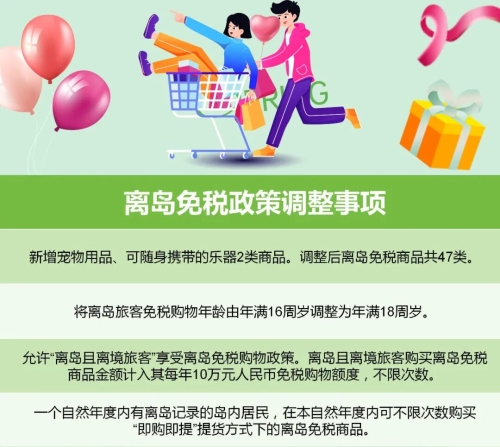 為進(jìn)一步擴(kuò)大政策效應(yīng),支持海南自由貿(mào)易港建設(shè),現(xiàn)將海南離島旅客免稅購(gòu)物政策(以下稱(chēng)離島免稅政策)調(diào)整事項(xiàng)公告如下: