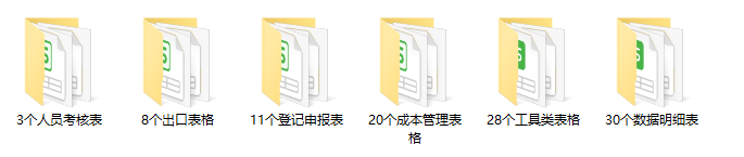 包含:30個(gè)數(shù)據(jù)明細(xì)表、20個(gè)成本管理表格、28個(gè)工具類表格、11個(gè)登記申報(bào)表、8個(gè)出口表格、3個(gè)人員考核表