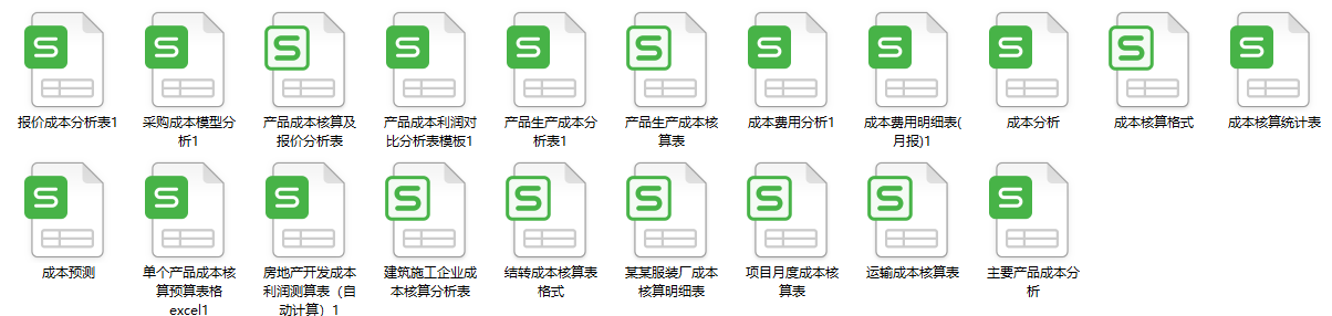 包含報(bào)價(jià)成本分析表、采購(gòu)成本模型分析、產(chǎn)品成本核算及報(bào)價(jià)分析表、產(chǎn)品生產(chǎn)成本核算表、成本費(fèi)用明細(xì)表、項(xiàng)目月度成本核算表等。