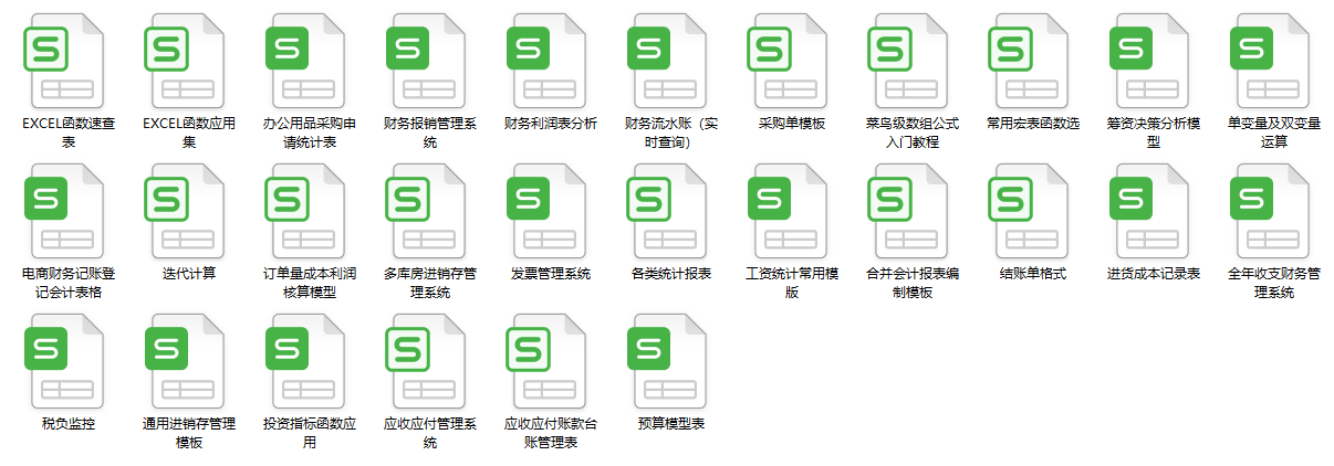 包含Excel函數(shù)速查表、函數(shù)應(yīng)用集、財(cái)務(wù)報(bào)銷管理系統(tǒng)、財(cái)務(wù)利潤(rùn)表分析、合并會(huì)計(jì)報(bào)表編制模板、進(jìn)貨成本記錄表、全年收支財(cái)務(wù)管理系統(tǒng)等。