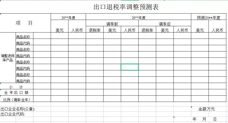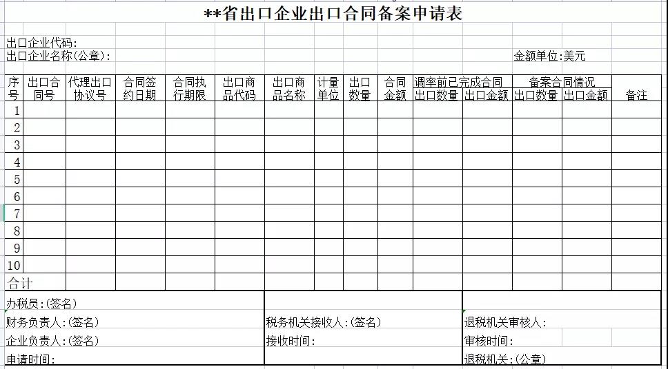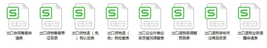 出口合同備案申請(qǐng)表,出口貨物退稅認(rèn)定表,出口退稅率調(diào)整預(yù)測(cè)表等。