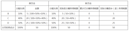 第一季度預繳申報時,B、C、D分支機構(gòu)均參與分配,按照10%、40%、50%分配比例計算,具體如下: