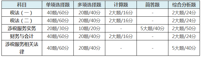 《稅法一》《稅法二》《涉稅服務(wù)相關(guān)法律》和《財(cái)務(wù)與會(huì)計(jì)》的綜合分析題均以選擇題的形式呈現(xiàn),每個(gè)大題包含6道小題,每小題2分。其考試題有可能是單選題,也有可能是多選題,一般情況下單選題有4個(gè)選項(xiàng),多選題有5個(gè)選項(xiàng)。