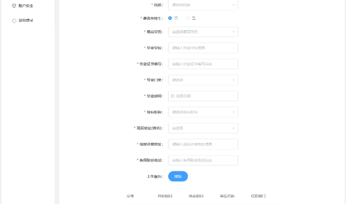 如不是在校應屆生須在“是否是在校生”處選擇“否”,然后根據(jù)下方提示填寫個人信息并上傳工作履歷;