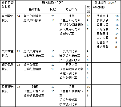 企業(yè)綜合績效評價標準分為財務績效定量評價標準和管理績效定性評價標準:財務 績效定量評價標準包括國內(nèi)行業(yè)標準和國際行業(yè)標準。其中國內(nèi)行業(yè)標準根據(jù)國內(nèi)企業(yè)年度財務和經(jīng)營管理統(tǒng)計數(shù)據(jù),運用數(shù)理統(tǒng)計方法,分年度、分行業(yè)、分規(guī)模統(tǒng)一測算并發(fā)布國際行業(yè)標準根據(jù)居于行業(yè)國際領先地位的大型企業(yè)相關財務指標實際值,或者根據(jù)同類型企業(yè)組相關財務指標的先進值,在剔除會計核算差異后統(tǒng)一測算并發(fā)布:財務績效 定量評價標準按用不同行業(yè)、不同規(guī)模及指標類別,分別測算出優(yōu)秀值、良好值、平均值、較低值和較差值五個檔次:企業(yè)綜合績效評價指標權重實行百分制,指標權重依據(jù)評價指標的重要性和各指標的引導功能通過征求咨詢專家意見和組織必要的測試進行確定。其中,財務績效定量評價指標權重確定為70,管理績效定性評價指標權重確定為30%。在實際評價過程中,財務績效定量指標和管理績效定性評價指標的權數(shù)均按百分制設定,分別計算分項指標的分值,然后按照70:30折算。各評價指標權數(shù)如表2-3所示。