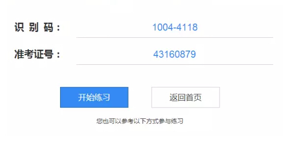 隨后獲得如下圖所示的練習(xí)賬號(hào),包括八位的“識(shí)別碼”和“準(zhǔn)考證號(hào)”,保存好這兩個(gè)號(hào)碼,就可以點(diǎn)擊“開(kāi)始練習(xí)”啦!
