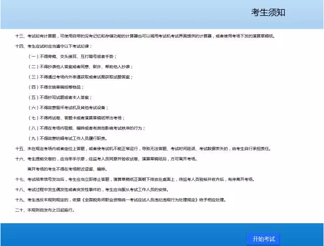 接著,出現(xiàn)如下圖所示的“考生須知”界面,閱讀完須知點(diǎn)擊“開(kāi)始考試”進(jìn)入答題環(huán)節(jié)。