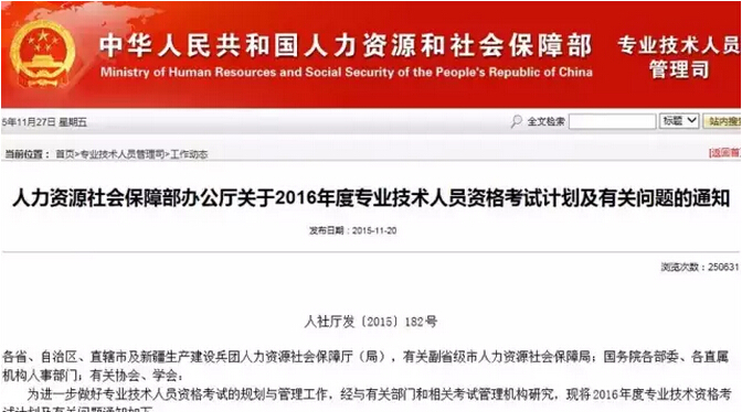 人力資源社會保障部辦公廳關(guān)于2016年度專業(yè)技術(shù)人員資格考試計劃及有關(guān)問題的通知