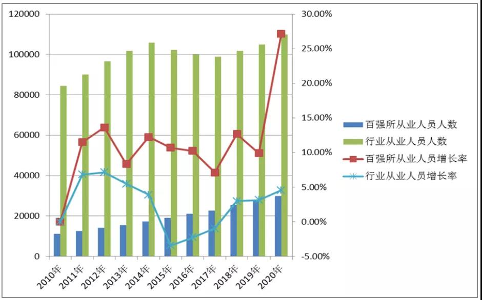 圖9:百?gòu)?qiáng)所從業(yè)人員人數(shù)及增長(zhǎng)率與行業(yè)對(duì)比圖