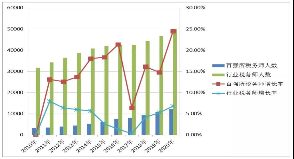 圖10:百?gòu)?qiáng)所稅務(wù)師人數(shù)及增長(zhǎng)率與行業(yè)對(duì)比圖