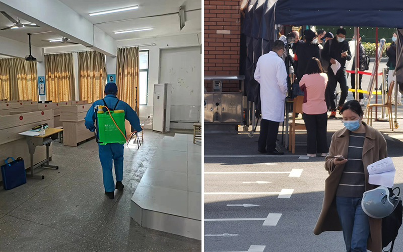 左圖為專業(yè)人員為考場消毒 ;右圖為考生們持48小時核酸檢測報告依次進入考場