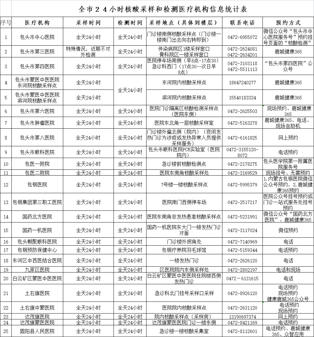 為更好的滿足群眾核酸檢測需求,提供優(yōu)質(zhì)高效的核酸采樣和檢測服務(wù),現(xiàn)將全市開展24小時核酸采樣和檢測服務(wù)醫(yī)療機構(gòu)名單公布如下。請根據(jù)表中核酸檢測預(yù)約方式提前預(yù)約核酸檢測。