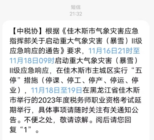 受極端天氣影響,根據(jù)《佳木斯市氣象災(zāi)害應(yīng)急指揮部關(guān)于啟動(dòng)重大氣象災(zāi)害(暴雪)II級(jí)應(yīng)急響應(yīng)的通告》,佳木斯市主城區(qū)實(shí)行“五停”措施(停課、停工、停產(chǎn)、停運(yùn)、停業(yè)),為保障應(yīng)試人員安全,經(jīng)研究,決定延期舉行原定于11月18日至19日的2023年度(佳木斯市)稅務(wù)師職業(yè)資格考試。具體考試日期另行公告。
