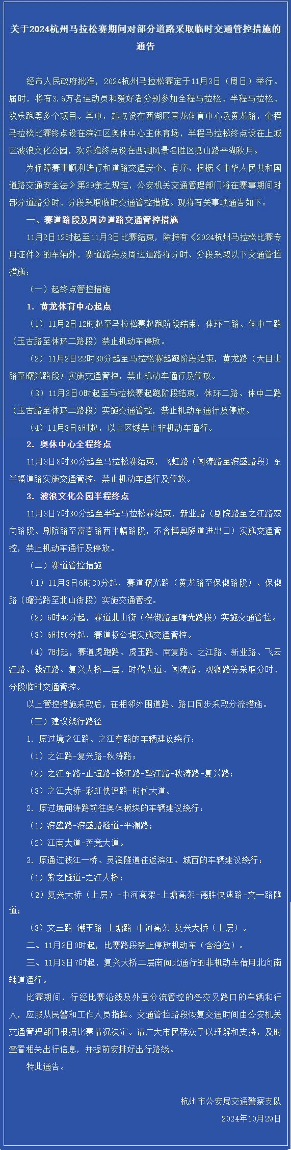 附:關(guān)于2024杭州馬拉松賽期間對(duì)部分道路采取臨時(shí)交通管控措施的通告