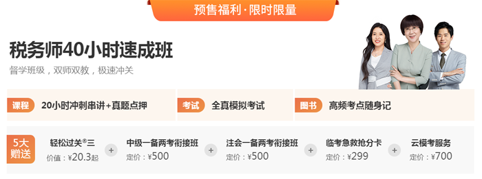 東奧稅務(wù)師40小時(shí)速成班正在火熱預(yù)售中,預(yù)售期間老學(xué)員更有專屬特惠!快來戳我一鍵領(lǐng)取限時(shí)優(yōu)惠吧>>>快來一起拒絕盲目備考,決勝2021年稅務(wù)師考試吧!