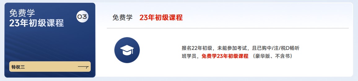 報(bào)名22年初級(jí),未能參加考試,且已購中/注/稅D暢聽班學(xué)員,免費(fèi)學(xué)23年初級(jí)課程(豪華版、不含書)