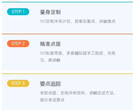 全過程從備考學(xué)習(xí)效果出發(fā),1V1專項(xiàng)輔導(dǎo),從帶學(xué)、帶練、答疑、沖刺四個方面貫穿整個備考過程。