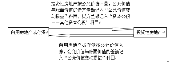 投資性產(chǎn)房地采用公允價(jià)值計(jì)量模式的房地產(chǎn)轉(zhuǎn)換如下圖所示: