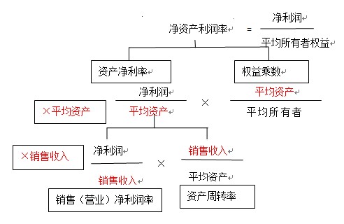 。ǘ┒虐詈诵墓絻糍Y產(chǎn)利潤率(凈資產(chǎn)收益率)=資產(chǎn)凈利潤率×權(quán)益乘數(shù)資產(chǎn)凈利潤率=銷售凈利潤率×資產(chǎn)周轉(zhuǎn)率凈資產(chǎn)利潤率(凈資產(chǎn)收益率) =銷售凈利率(盈利能力)×資產(chǎn)周轉(zhuǎn)率(營運(yùn)能力)×權(quán)益乘數(shù)(償債能力)
