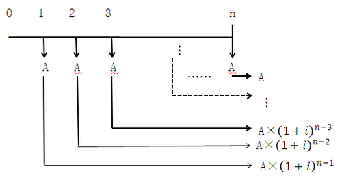 根據(jù)復(fù)利終值的計算公式,將每期期末存入的年金A復(fù)利到第n期期末,然后再相加,求出F: