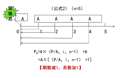 公式2:PA=A×[(P/A,i,n-1)+1](期數(shù)減1,系數(shù)加1)