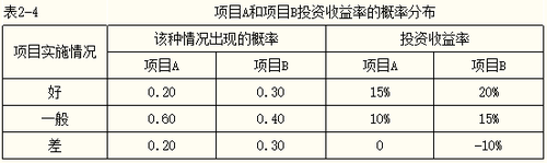 【例題】某企業(yè)有A、B兩個投資項目,兩個投資項目的收益率及其概率分布情況如表2-4所示,請分別計算A、B兩個項目投資收益率的標準離差,并比較A、B兩個項目的風險大小。