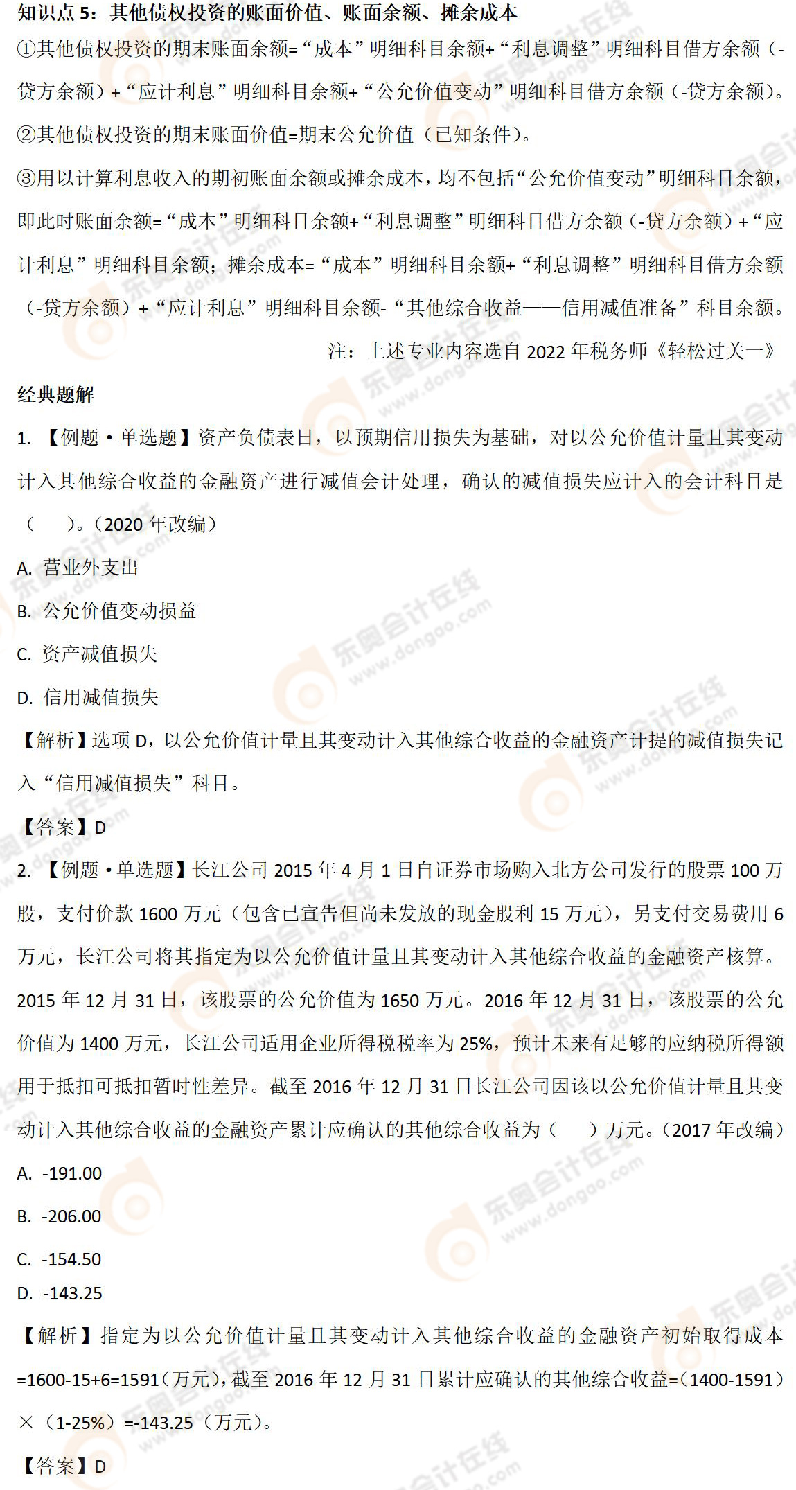 知識點(diǎn):其他債權(quán)投資的賬面價(jià)值、賬面余額、攤余成本