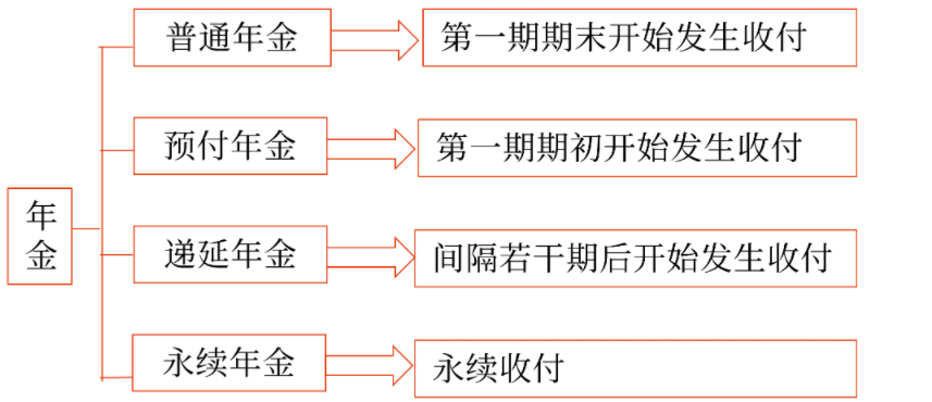 【年金的種類】:普通年金、預(yù)付年金、遞延年金、永續(xù)年金。