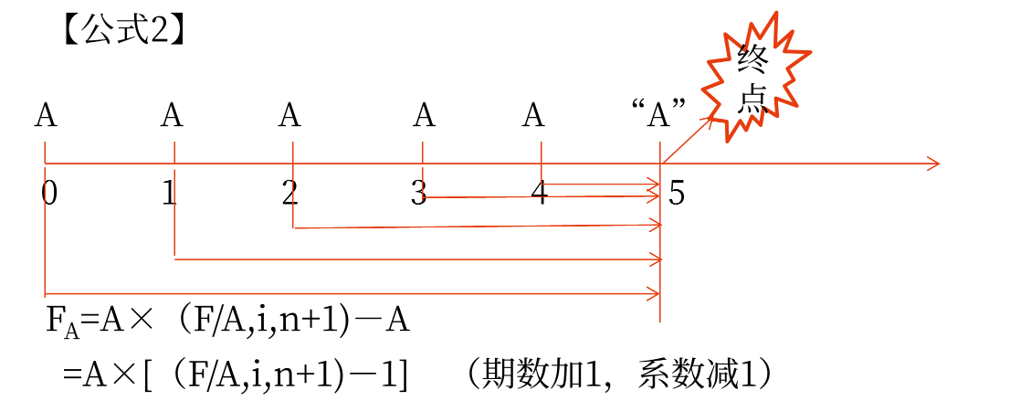 公式2:FA=A×[(F/A,i,n+1)-1](期數(shù)加1,系數(shù)減1)
