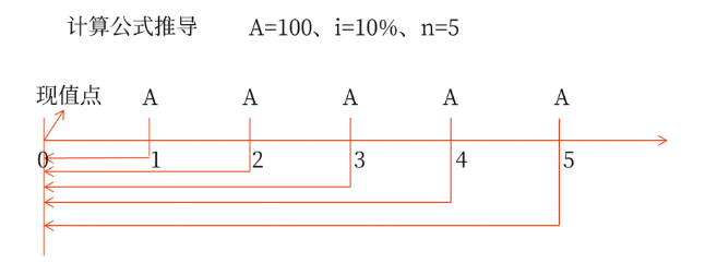 PA=100×(1+10%)-1+100×(1+10%)-2+100×(1+10%)-3+100×(1+10%)-4+100×(1+10%)-5=100×[1-(1+10%)-5]÷10%