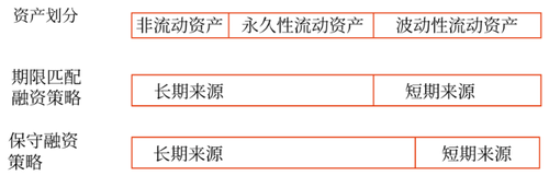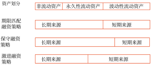 根據(jù)資產(chǎn)的期限結(jié)構(gòu)與資金來源的期限結(jié)構(gòu)的匹配程度差異,流動(dòng)資產(chǎn)的融資策略可以劃分為:期限匹配融資策略、保守融資策略和激進(jìn)融資策略三種基本類型。