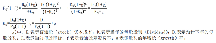 按照未來現(xiàn)金流量折現(xiàn)法的財務(wù)估值模型,一項資產(chǎn)的價值等于其未來現(xiàn)金流量的現(xiàn)值。所以,為使得股票目前的市場價值(扣除籌資費用后)等于其未來每年支付股利的現(xiàn)值的折現(xiàn)率,即為普通股的資本成本Ks。