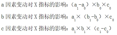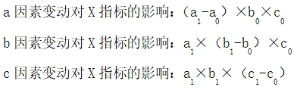 (2)-(1)即為a因素變動對X指標(biāo)的影響 (3)-(2)即為b因素變動對X指標(biāo)的影響 (4)-(3)即為c因素變動對X指標(biāo)的影響 |
